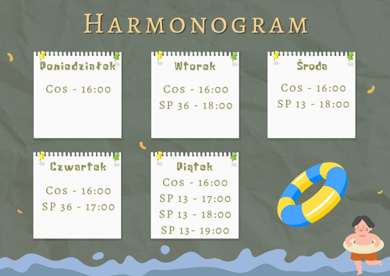 Zajęcia odbywają się codziennie w godzinach popołudniowych na basenach w Bielsku-Białej i Szczyrku